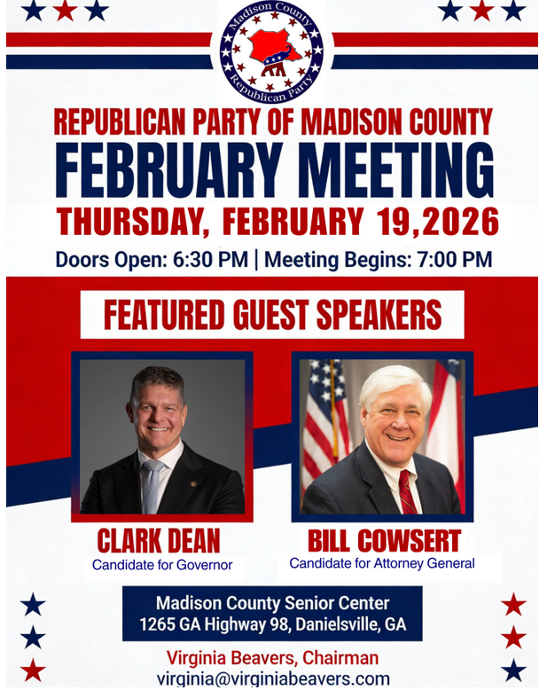 Republican Party of Madison County will meet February 19, 2026 at the Madison County Senior Center at 1265 Highway 98 W., Danielsville, GA 30633 at 7 pm (doors open at 6:30 pm). The speakers will be Clark Dean, a candidate for Governor and Bill Cowsert, a candidate for Attorney General.